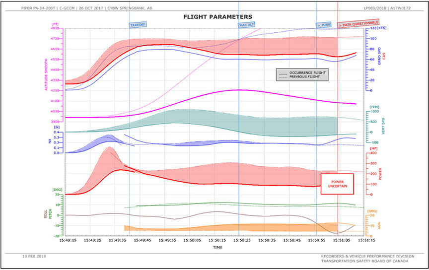 The analysis was repeated using the global positioning system (GPS) data for takeoffs conducted on the other SATC Seneca II, which took place on 17 and 22 March 2018.Footnote 19 The comparison data showed take-off speeds comparable to those on the occurrence flight. The other Seneca II demonstrated a higher climb rate, which ranged between 500 fpm and 1000 fpm, and eventually stabilized at about 600 fpm. The flight on 22 March 2018 showed even higher climb rates.