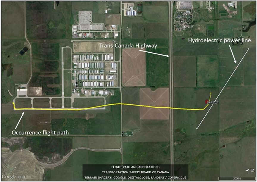 The aircraft then entered a tight descending and rolling left turn approximately 300 feet north of hydroelectric power lines that were running in an east–west direction. The estimated airspeed dropped to about 65 KCAS when the aircraft was at an altitude of about 100 feet AGL (Figure 1 and Figure 2).