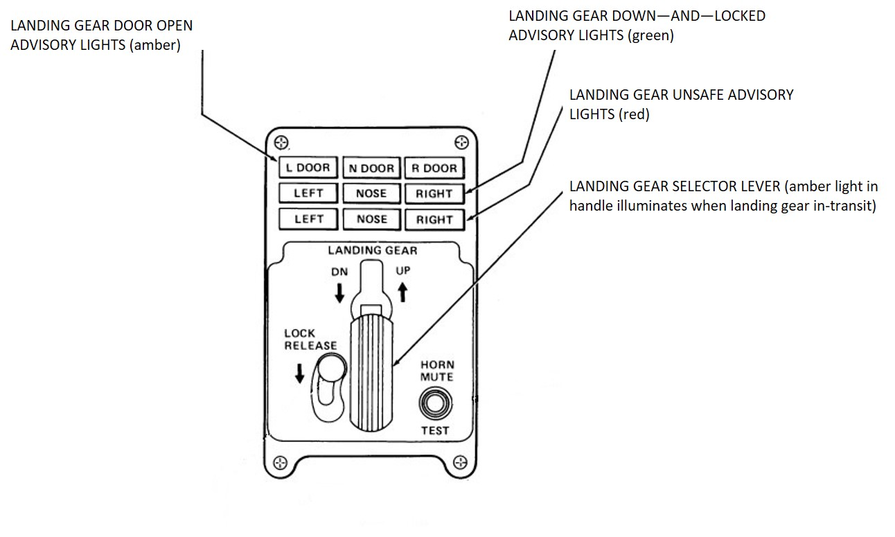 The landing gear is raised or lowered using the landing gear selector lever. An amber light in the lever illuminates when the landing gear is in transit (i.e., the actual position does not match the selected position). Nine advisory lights at the top of the panel indicate the landing gear and landing gear door positions. An amber gear door open advisory light illuminates when its respective door is open. A green landing down‑and‑locked advisory light illuminates when the respective gear is down‑and‑locked. A red landing gear unsafe advisory light illuminates when the respective gear is neither uplocked nor downlocked.