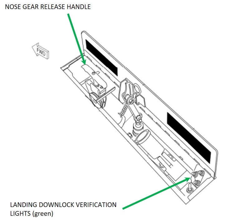 The landing gear alternate extension door in the cockpit floor is then opened and a handpump is available to fully extend the main landing gear if required. Adjacent to the handpump is the nose gear release handle (Figure 3). The first stage of the pull on the nose gear release handle unlocks the NLG forward doors. The second stage of the pull unlocks the NLG from the up position. Complete extension of the NLG is by free fall and airflow encountered inflight. An alternate down lock verification system provides a means to verify that the associated landing gear is in the down‑and‑locked position.