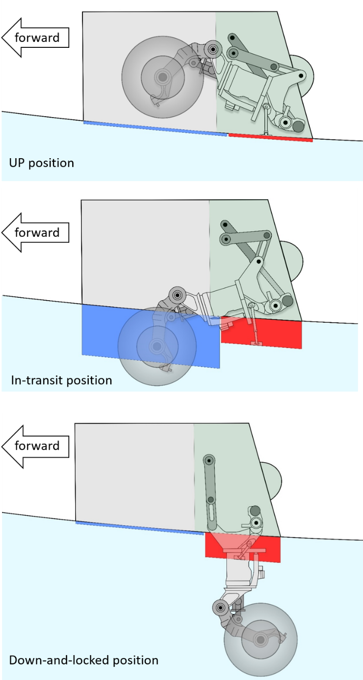 The NLG shock strut was manufactured by Safran Landing Systems, Canada Inc. (SafranLS) for Bombardier. The NLG shock strut absorbs the shock of landing and gives stability and direction control during aircraft taxi. It retracts up and forward into its wheel well in the nose section of the fuselage. When the dual-wheeled landing gear is in the up position, the landing gear doors completely enclose it. The forward doors are hydraulically opened and closed, and the aft doors are mechanically linked to the shock strut. When the landing gear is lowered into the down-and-locked position, the forward doors will normally be closed and the aft doors will remain open (Figure 4).