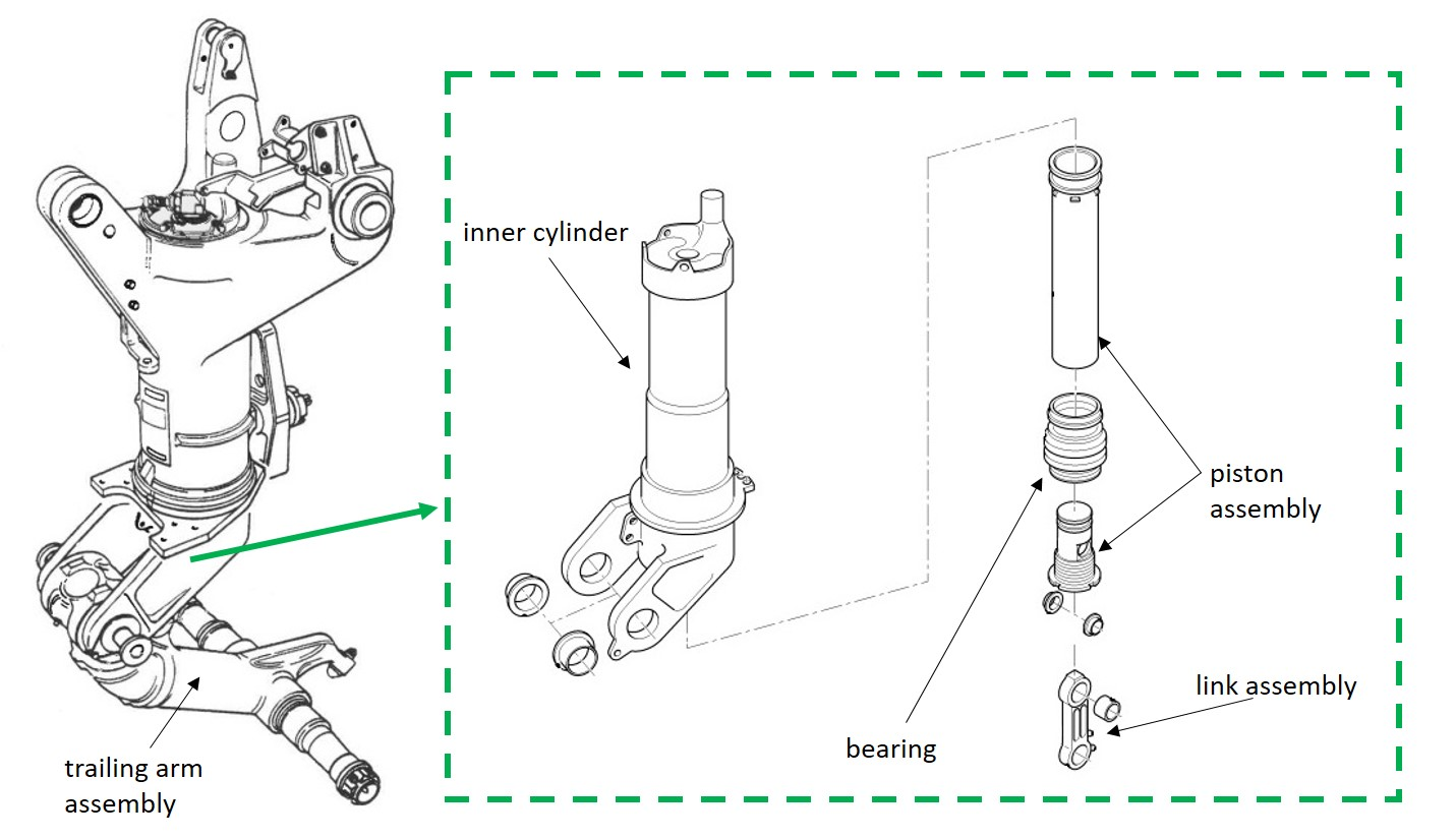 The inner cylinder and piston assembly components absorb landing shock. The assembly is filled with hydraulic fluid and charged with nitrogen gas. The trailing arm assembly pivots at the inner cylinder attach lugs, and uses a link to connect to the piston assembly that moves in and out of the inner cylinder. The piston slides in a bearing that is mounted inside the lower bore of the inner cylinder.Footnote 11