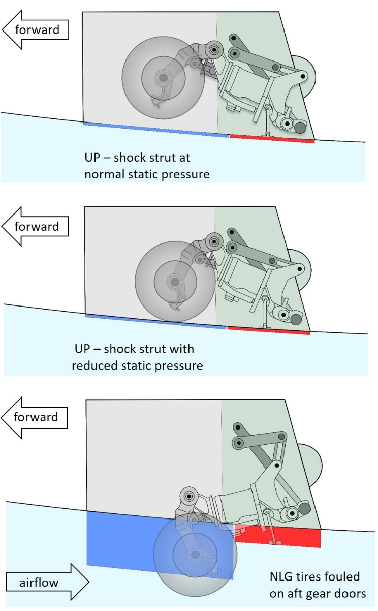 - The airflow encountered in flight when the nose landing gear was lowered further compressed the nose landing gear shock strut and allowed the tires to impinge on the aft landing gear doors, thereby jamming the nose landing gear in a partially extended position.