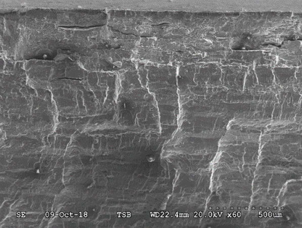 - The fracture surface of the fatigue crack was examined under the scanning electron microscope, and a significant number of secondary cracks were found parallel to and underneath the inboard surface of the base of the bracket (Figure 6). These cracks resembled material delamination.