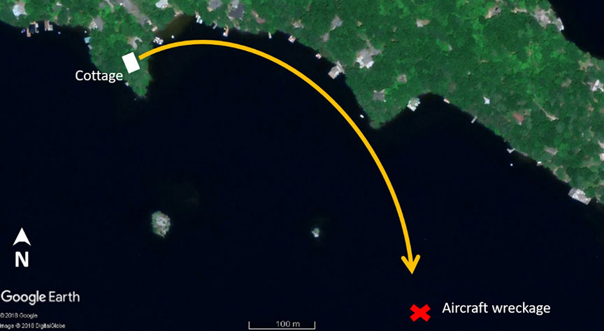At about 1930, the pilot descended and flew over the cottage, which was on the west point of a small bay (Figure 1), at about 80 knots indicated airspeed (KIAS). He then circled around to fly over the cottage again, flying just above tree-top level. Witnesses saw people standing outside at the cottage, watching the aircraft fly over. The aircraft closely cleared some trees before entering a right turn and flying along the shoreline of the small bay to the east of the cottage. The bank angle in the right turn became steepFootnote 3 as the aircraft headed toward a wooded point on the east side of the bay. The aircraft turned before reaching the wooded point and continued turning to the south in a steep right bank and began to lose altitude as the nose pitched down. The aircraft reportedly did not respond to left aileron input. The aircraft continued to descend, and struck the surface of the water in a steep right-bank, nose-low attitude. It then cartwheeled before coming to rest in the water. Both occupants were wearing 4-point safety harnesses and sustained minor injuries.