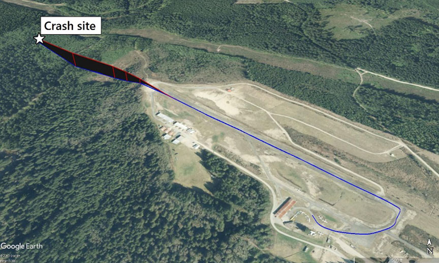 At about 1444, the aircraft took off from Runway 29 with the flaps in the retracted (up) position. It remained on the runway for almost three quarters of the runway's length before lifting off. The aircraft climbed for several seconds, reaching a maximum height of about 100 feet above runway elevation and wobbledFootnote 2 several times during the flight. The aircraft maintained a nose-up attitude and slowly decelerated as it crossed the Chapman Creek ravine. It was airborne for less than 30 seconds before it collided with trees and crashed on the far side of the ravine, about 0.35 nm from the departure end of the runway (Figure 1).