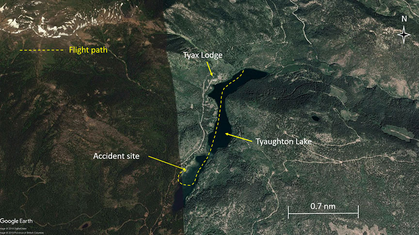 A local report described the weather conditions at Tyaughton Lake at the time of the accident as clear skies, wind between 9 and 11 km/h from the south-southeast, temperature 24.8 °C, dew point 12.2 °C, and a pressure setting of 30.03 inHg.