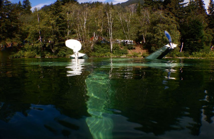 Shortly after takeoff, while the plane was climbing through approximately 300 feet, the other company pilot observed fuel leaking from the left wing and communicated that information to the pilot. The other company pilot reportedly told the pilot to turn around and return to land on the lake. Given the local terrain, the pilot reduced the airspeed and banked the aircraft steeply to the right, turning back toward the lake. The aircraft then abruptly rolled further to the right and struck the lake in a near-vertical attitude at approximately 1255 (Figure 2). The aircraft was substantially damaged on impact and sank.