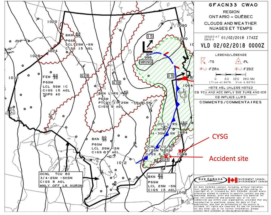 Graphical area forecasts (GFAs) are a tool available to pilots that shows the general upcoming weather conditions for a given geographic area.Footnote 8 On the day of the accident, the GFAs issued at 1242 and valid at 1900 (appendices A and B) provided the following weather forecasts for the area between the cold front and the north shore of the St. Lawrence River: