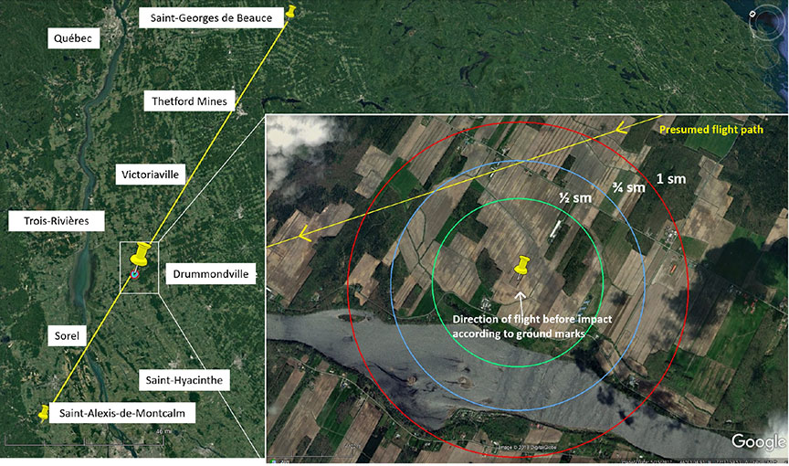 In order to determine what the weather conditions may have been at the time and place of the accident, the ECCC assessment was based on information from the Villeroy weather radar, which was located about 50 sm northeast, and on the observations recorded at the following weather stations located closest to the accident site: