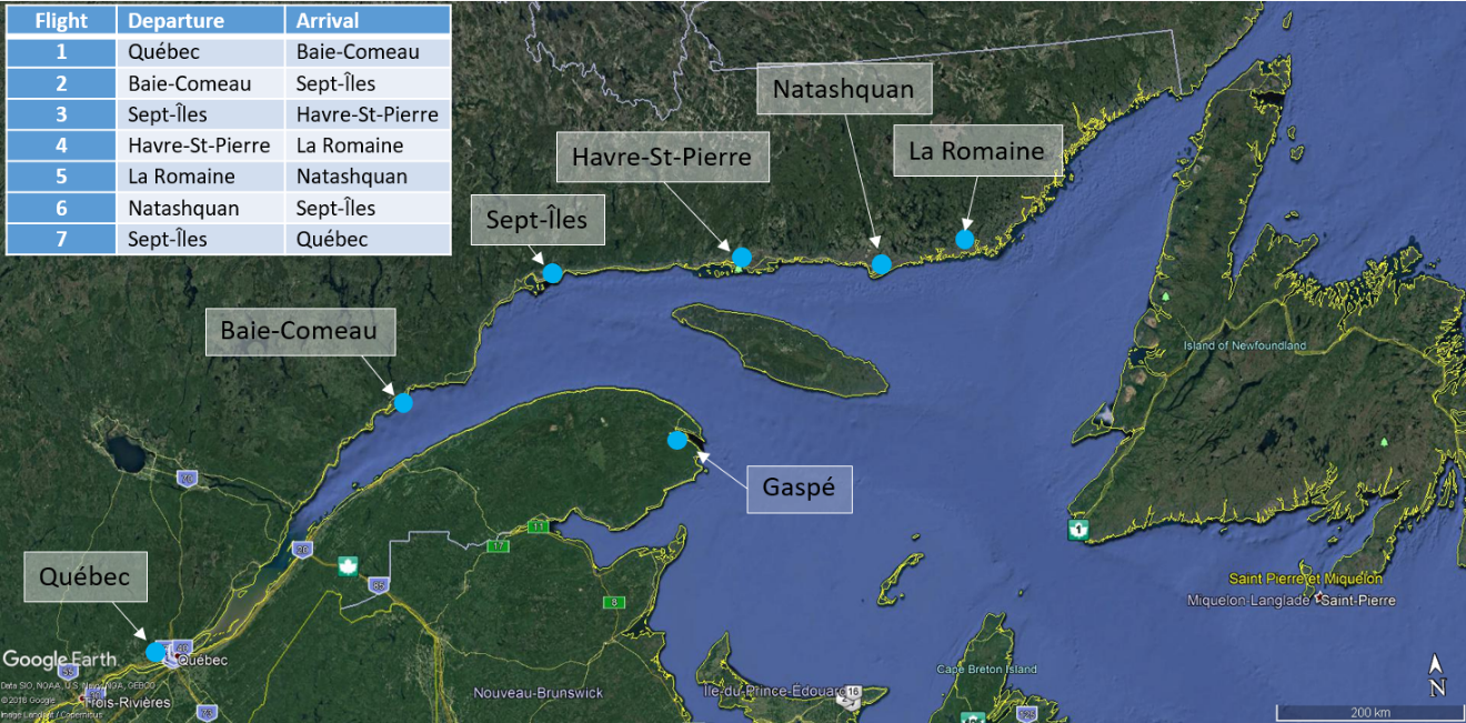 On 26 February 2018, the 2 pilots who comprised the flight crew of the Beechcraft King Air A100 (registration C-GJXF, serial number B-159) operated by Strait Air (2000) Ltd. (Strait Air) arrived at the Québec/Jean Lesage International Airport (CYQB), Quebec, to begin their work day, which started at 0600.Footnote 7 That day, they were scheduled to conduct a series of 7 charter flightsFootnote 8 (Figure 1). Departure for the first flight from CYQB was scheduled for 0710, and the last flight to CYQB was scheduled to arrive at the end of the day, at 1800.