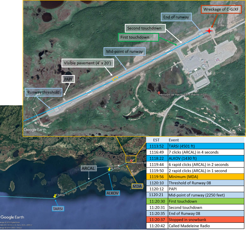 On 26 February 2018, a Beechcraft King Air A100 (registration C-GJXF, serial number B‑159) operated by Strait Air (2000) Ltd. was conducting charter flight NUK107 according to instrument flight rules, from the Sept-Îles Airport, Quebec, to the Havre St-Pierre Airport, Quebec, with 2 crew members and 6 passengers on board. The aircraft conducted an approach to Runway 08, which was snow-covered, while visibility was reduced due to heavy snow showers, and landed approximately 3800 feet beyond the threshold, at approximately 700 feet from the end of the runway. It continued its landing roll beyond the runway until it came to rest in a snowbank, approximately 220 feet beyond the end of the runway. The accident occurred in daylight, at 1120 Eastern Standard Time. The emergency locator transmitter, transmitting on 406 MHz, did not activate. The aircraft sustained substantial damage. Four of the occupants received minor injuries.