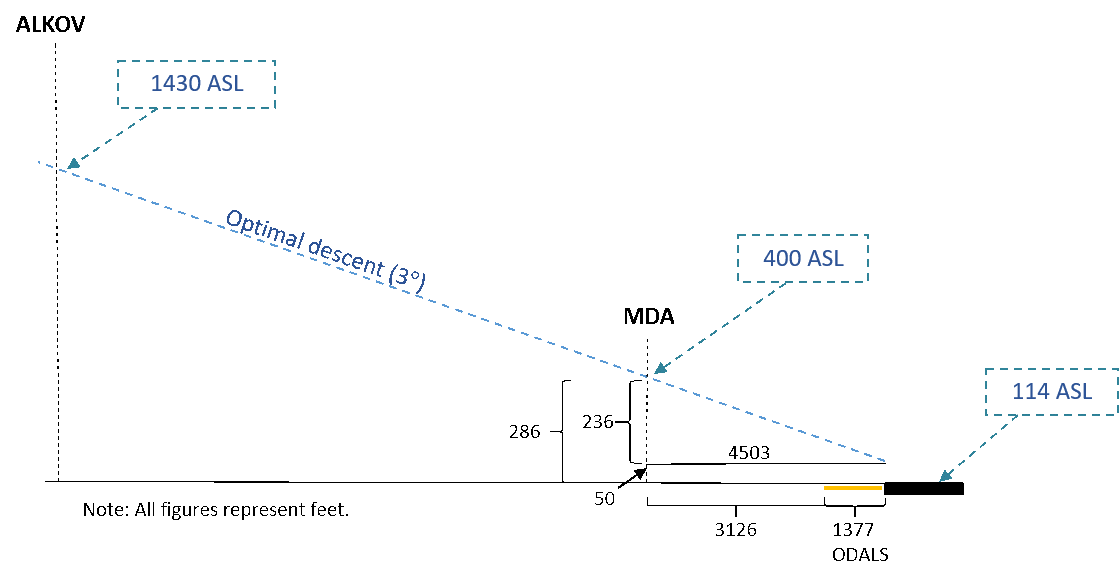 At 1118, the crew indicated that it was at final approach fix (FAF) ALKOV, 4 NM from the runway threshold. The aircraft was on an optimal glide slope of 3°, at 1430 feet ASL. Approximately 1 minute later, the PM made calls, in accordance with standard operating procedures (SOP), at 100 feet above the published minimum descent altitude (MDA) (which is 400 feet ASL or 286 feet above ground level [AGL]), then at the MDA. At the MDA, which the aircraft attained 0.74 NM (0.85 SM) from the threshold of Runway 08, the PM also told the PF that he had no visual contact. A few seconds later, still lacking visual contact, the PM asked the PF whether they should execute a go-around. The PF (and captain) then stated that he had visual contact and continued the descent below MDA in manual mode.