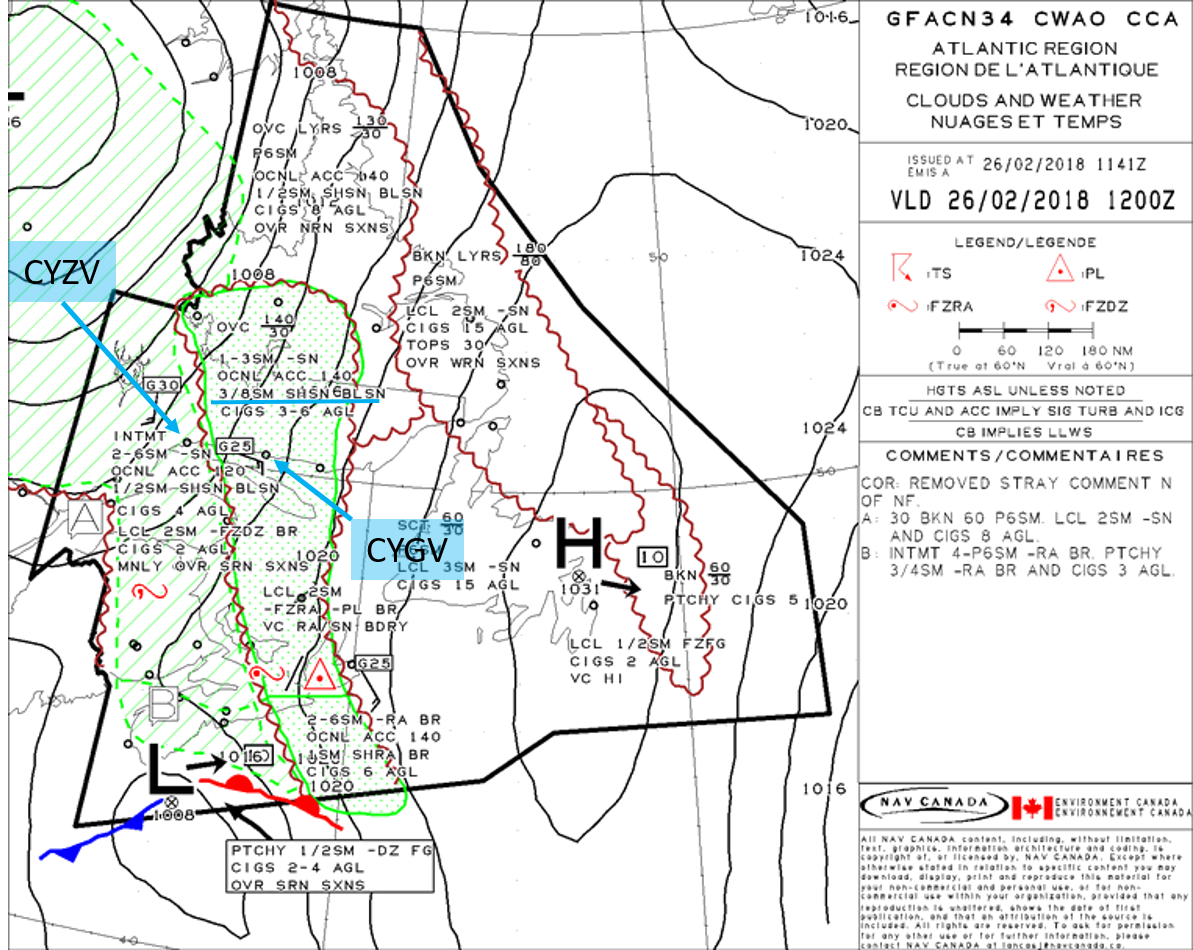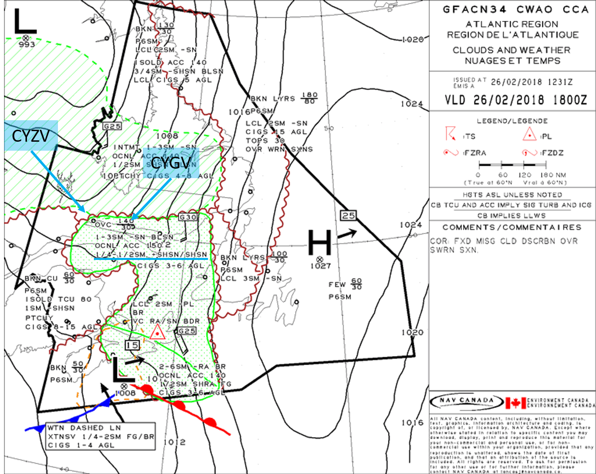 | SPECI CYGV 261704Z AUTO 15005KT 3/8SM SN BKN006 OVC011 M02/M02 A2980 RMK | Below minima |