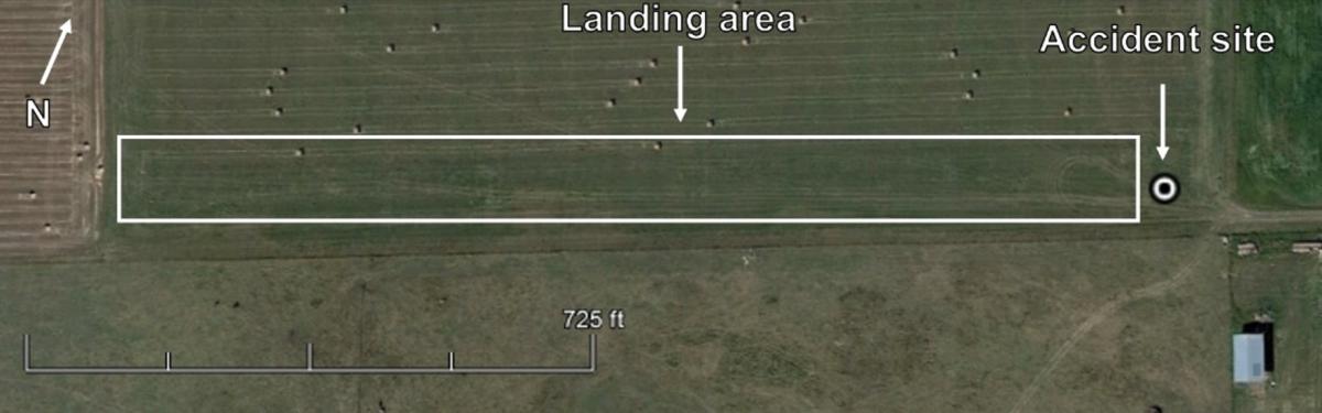The accident occurred in the southeast corner of a mixed-hay field located approximately 2 nm east of the town of Black Diamond. The rectangular field—approximately 2350 feet long and 1440 feet wide—is at an elevation of approximately 3820 feet ASL. The long side of the field is oriented in a north-south direction. The southern edge of the field was used as the landing area, and the elevation there varied between 3801 feet ASL and 3807 feet ASL (Figure 3).