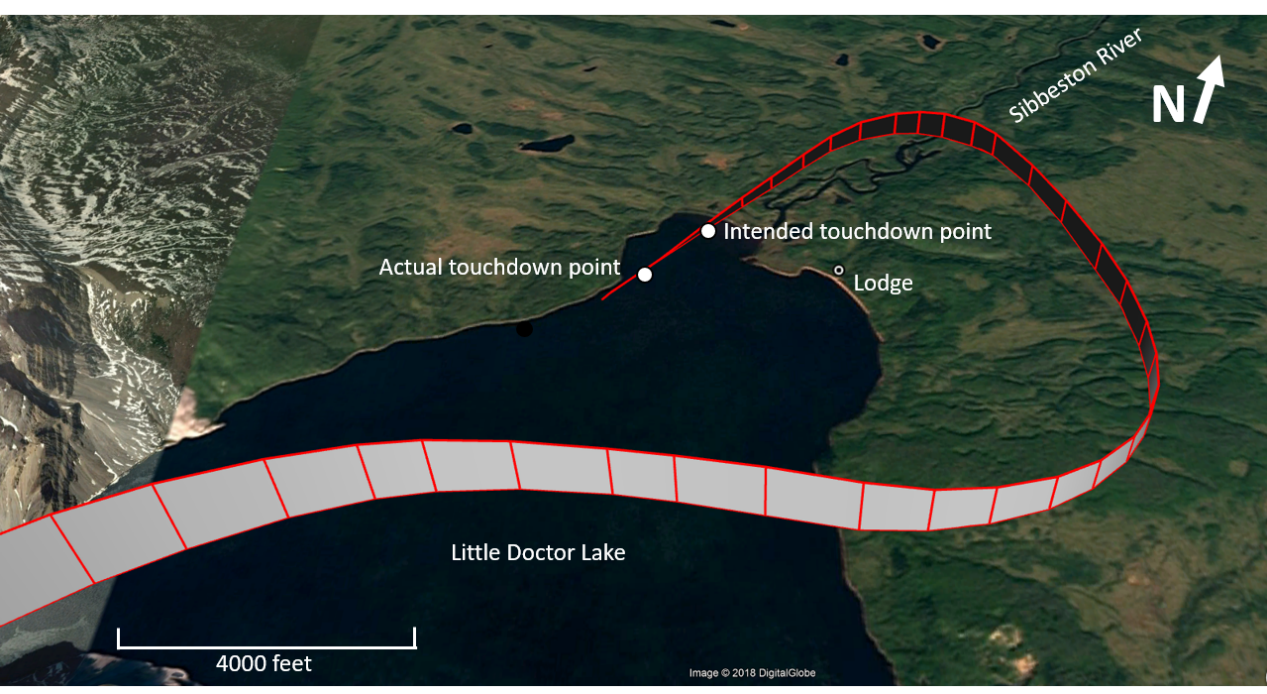 The destination of the occurrence flight, Little Doctor Lake, is susceptible to unpredictable winds, resulting in significant wave action, due to a gap in the mountain range on the west side of the lake. With this in mind, the pilot chose to fly through the gap in the mountains, circle to the south, and then around the eastern shore to get a good look at the surface of the lake. The intention was to land in a bay in the northern corner of the lake. This allowed a descent over the Sibbeston River, leading to a touchdown in the bay, which generally had calmer conditions than the main body of the lake and was not affected by strong airflows out of the gap in the mountain range.