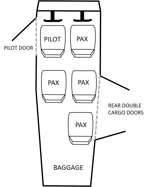 The Cessna U206G is equipped with 2 exits: a pilot door on the left, next to the pilot’s seat, and double cargo doors on the right, in the rear of the cabin. The forward door of the double cargo doors is in line with the middle row of seats, and the aft door is in line with the rear seat. All seats face forward.