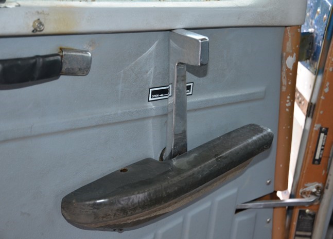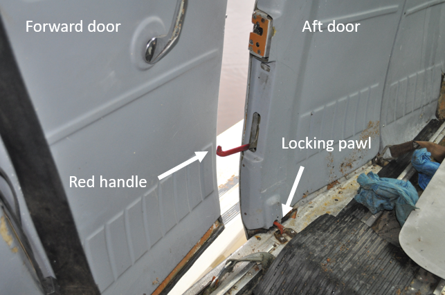 After the forward door is open, the aft door may be opened by grasping a red handle on the forward edge of the door and pulling downward to release the locking pawls (Figure 4).