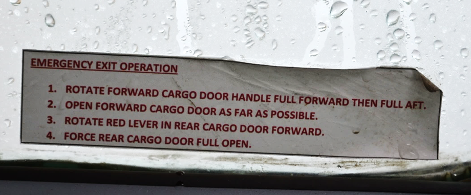 The procedure to open the door from the inside with the flaps down, which is listed on a placard above the handle on the forward cargo door (Figure 7), is the following: