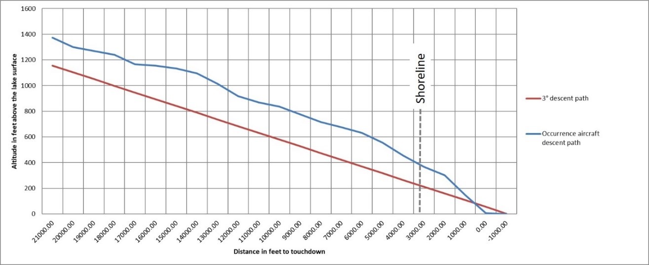 The pilot set the flaps to 20° and flew the approach, planning to land in the bay.Footnote 5 The approach was uneventful until approximately 300 feet above the surface of the water, when the rate of descent began to increase. The pilot increased power to compensate, resulting in the aircraft landing beyond the desired touchdown point.