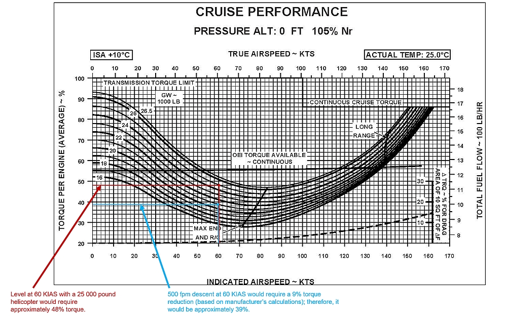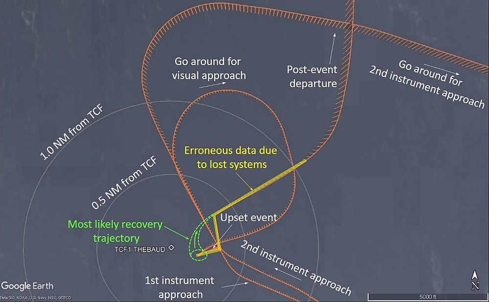 The captain, who could see the water and the TCF to the right of the helicopter, formally took control of the helicopter and began a near-vertical visual climb up to 150 feet RADALT, crosschecking with the standby instruments due to reduced visibility in fog. Some right yaw persisted during the climb and gradually reduced as the helicopter continued to climb. The aircraft flew in a widening right turn away from the vicinity of the upset and toward the northeast, accelerating from 30 KIAS to 80 KIAS (dashed zone shown in Figure 4; a detailed profile view is shown in Appendix B). A high-power setting (110–120% engine torque) was maintained during the initial climb and the Nr slowly increased, generally returning to 105% Nr at around 375 feet RADALT. As the helicopter climbed above 650 feet RADALT, engine torque was reduced to 100%, and continued steadily downward to approximately 70% as the helicopter reached 1350 feet RADALT.