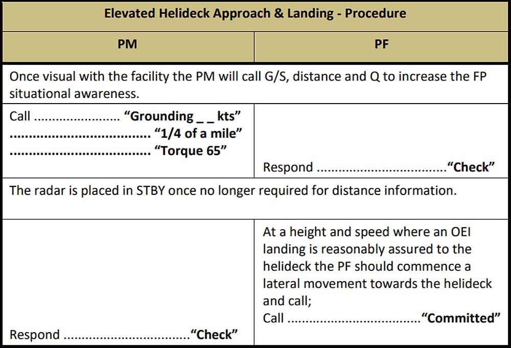 At 1333:14, when the helicopter was within 0.3 NM of the TCF, at 415 feet RADALT, its pitch attitude increased to 15° nose-up. Two seconds later, the pitch attitude increased to almost 17° nose-up, and the helicopter briefly banked 6° to the right. During that time, the PF’s attention was focused outside, looking at the helideck. The PM, who had been primarily focused on the helideck, shifted his attention inside the helicopter and onto the flight instruments because he was losing sight of the helideck, (given that he was occupying the right-hand seat). The PM recognized the nose-up pitch attitude and, in accordance with company SOPs, called “15 degrees”. As this was happening, the airspeed decreased below 40 KIAS. The rate of descent was 670 fpm and increasing. Neither pilot was aware of the increasing rate of descent, the low engine torque setting of 27%, or the increasing left sideslip.