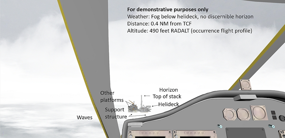 The first officer stowed his approach plate, and prepared to take control. Because the first officer was seated in the left seat, he did not have visual contact with the TCF until the helicopter rolled out on final. When the helicopter rolled out, the captain transferred control to the first officer (who was now the PF). The helicopter was still flying above the fog layer, and both pilots had a clear line of sight to the helideck. The estimated flight visibility was approximately 3 SM in the direction of the TCF; however, there was no discernible horizon behind the TCF.