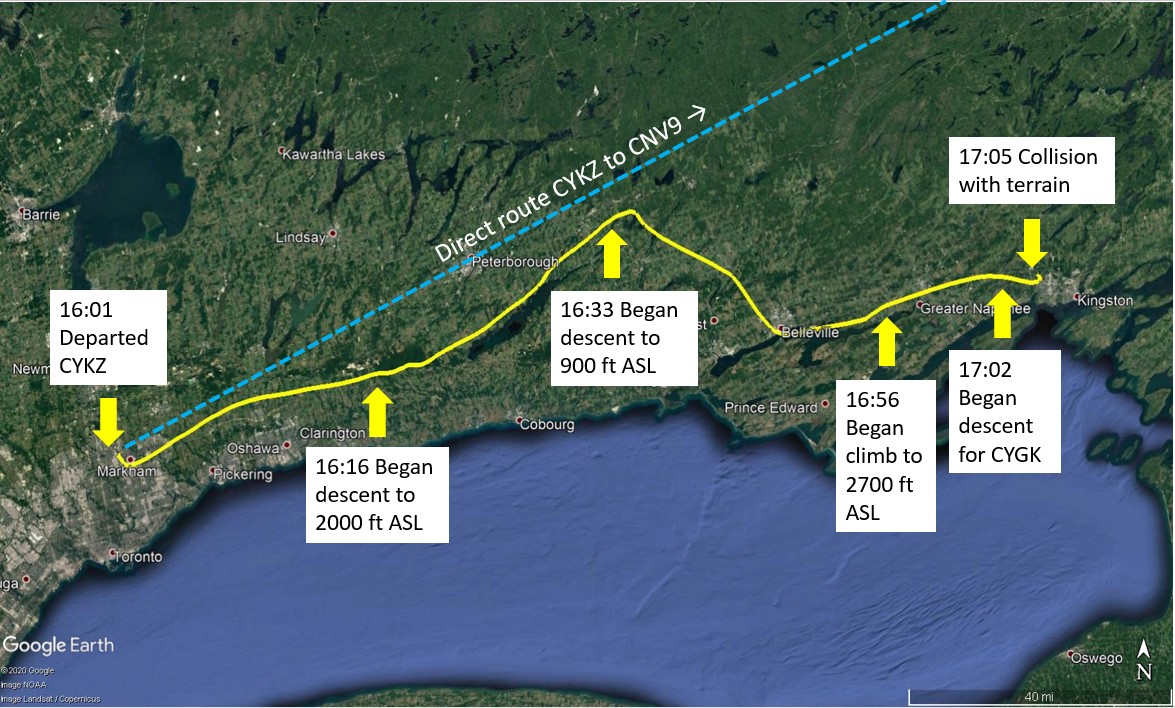 At 1633, the aircraft began a further descent and, at 1635, made a significant deviation toward the southeast, descending to as low as 900 feet ASL (200 feet above ground level [AGL]) near Havelock, Ontario. As the aircraft continued in a southeast direction toward Belleville, Ontario, the altitude varied between 1000 and 2800 feet ASL. Southwest of Belleville, at 1646, the aircraft turned toward the northeast at 2500 feet ASL.
