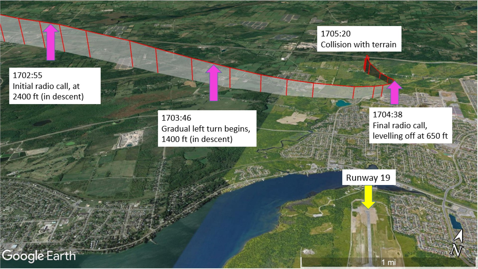At 1702:55, the pilot made his 1st radio call to the CYGK flight service station (FSS) indicating that he was 4 NM north, inbound for a straight-in approach on Runway 19. At this time, the aircraft was actually 4.5 NM to the west, tracking 102° magnetic (M), in a steady descent through 2400 feet ASL at approximately 760 fpm (Figure 2).