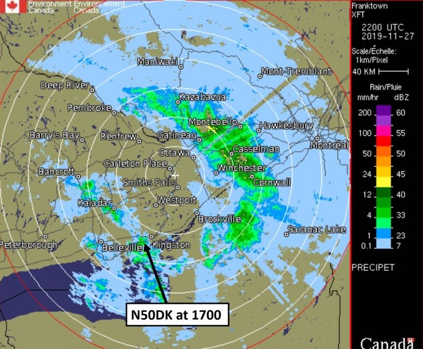 At the time of departure, there were 2 significant areas of precipitation depicted on Environment and Climate Change Canada radar between CYKZ and CYOW, approximately halfway to the planned destination along the flight-planned route. The 1st area, a narrow band of precipitation in a line from the northwest to the southeast, would be encountered near Peterborough, Ontario. Reduced visibility due to rain, mist, and low cloud (600 feet AGL) were reported in the area at the time of departure. The 2nd area contained more intense precipitation echoes and was widespread. The weather was moving in an eastward direction and the western edge formed a ragged line from the Pembroke, Ontario, area to the Kingston area.