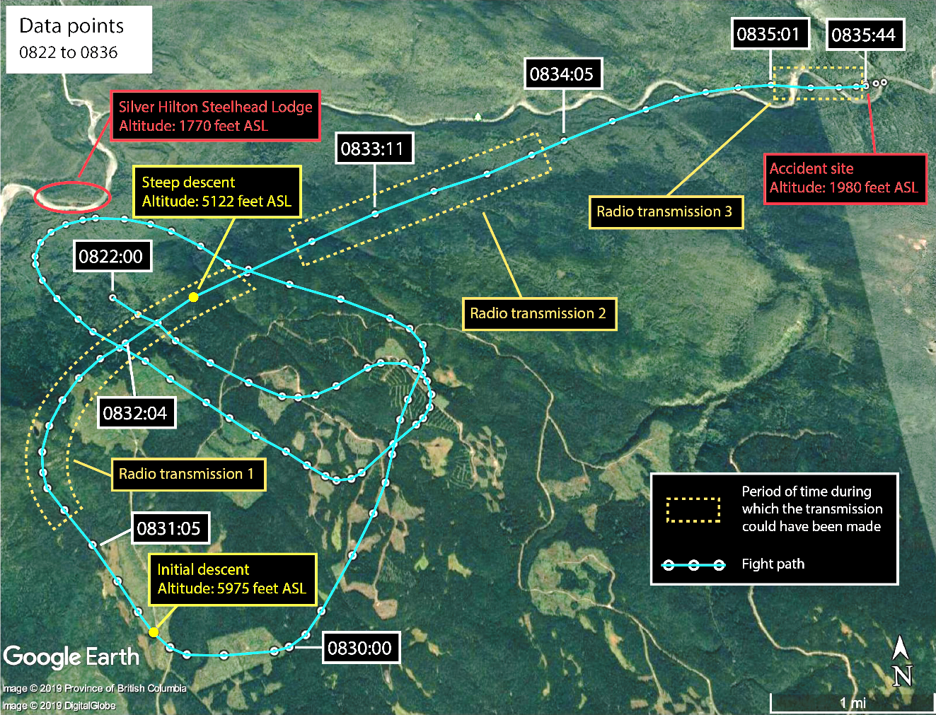 At 0833, the pilot transmitted a Mayday call to the NWFC dispatchers indicating that the flight would be unable to reach the Silver Hilton Steelhead Lodge airstrip and stated that he would “land 5 miles west”Footnote 5 of the airstrip (Figure 2, radio transmission 2).