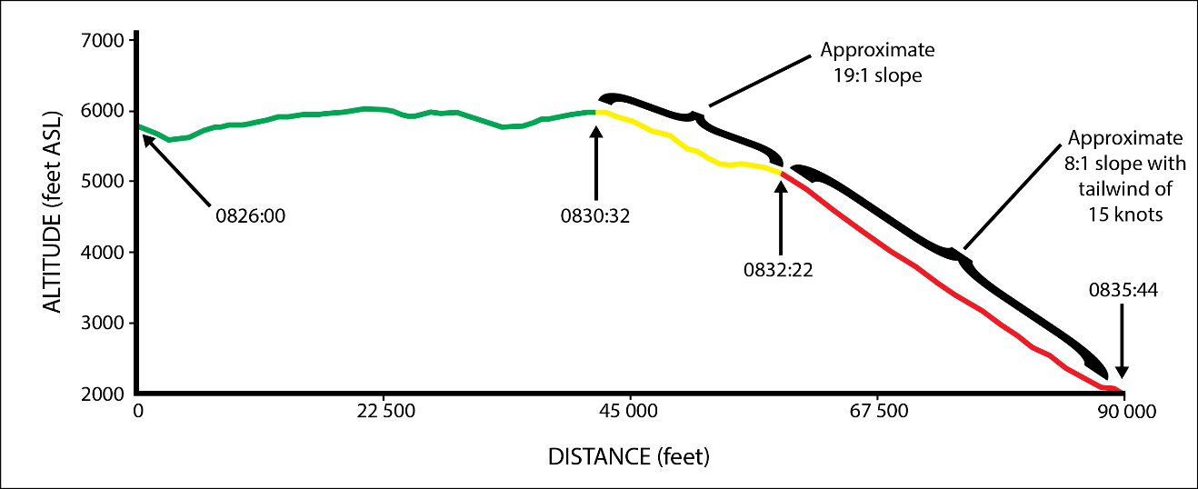 The GPS (global positioning system) data shows that when the aircraft’s performance started degrading, the aircraft started a shallow descent (about 19:1 glide ratio) that lasted for almost 2 minutes, consistent with partial engine power. This was followed by a steeper descent (about 8:1 glide ratio) that lasted for over 3 minutes, consistent with a complete engine power loss. The ice that likely formed in the carburetor would have initially reduced the engine’s ability to produce enough power to maintain altitude and eventually led to a complete loss of power.