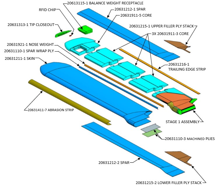 The Van Horn composite main rotor blade is dimensionally (span and chord) the same as the Bell aluminum blade. The blades are of a monocoque construction with carbon/epoxy skin material without a traditional D-spar. The D-spar is replaced by various layers of carbon/epoxy material (laminate stacks) on the upper and lower skins (Figure 3). Flight characteristics of the blades are similar enough that no changes to the performance section of the Bell 206B rotorcraft flight manual were required.