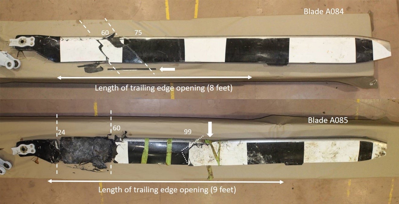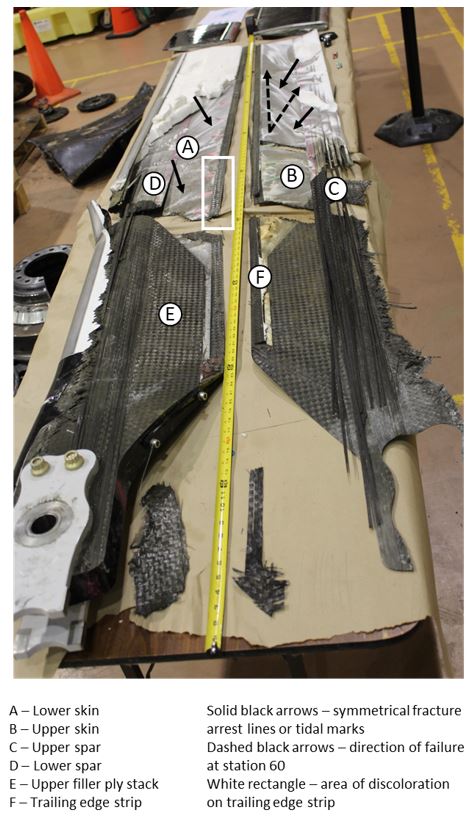 | Bonding between skins and core | A set of tidal marks (fracture arrest lines), indicating fracture progressed from inboard to outboard and trailing edge to leading edge. | A set of tidal marks (fracture arrest lines), indicating fracture progressed from inboard to outboard and trailing edge to leading edge. |