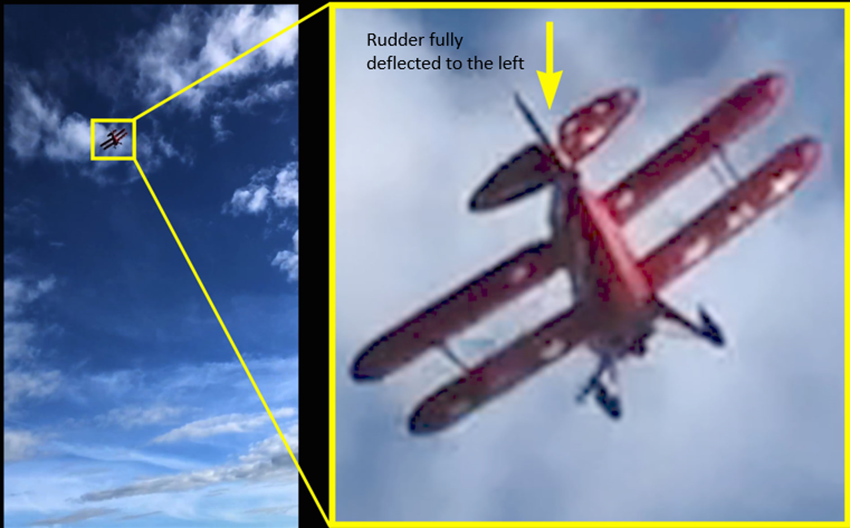 The videos also showed that the aircraft was in a skidding left turn for approximately 3 seconds (an uncoordinated turn). This type of skidding turn generally indicates poor coordination of flight controls (for example, too much pressure on the rudder pedal in the direction of the turn). In the screen captures taken from the videos, it is possible to see the position of the rudder, which was deflected completely to the left during the turn (Figure 2). It was not possible to determine the position of the ailerons.