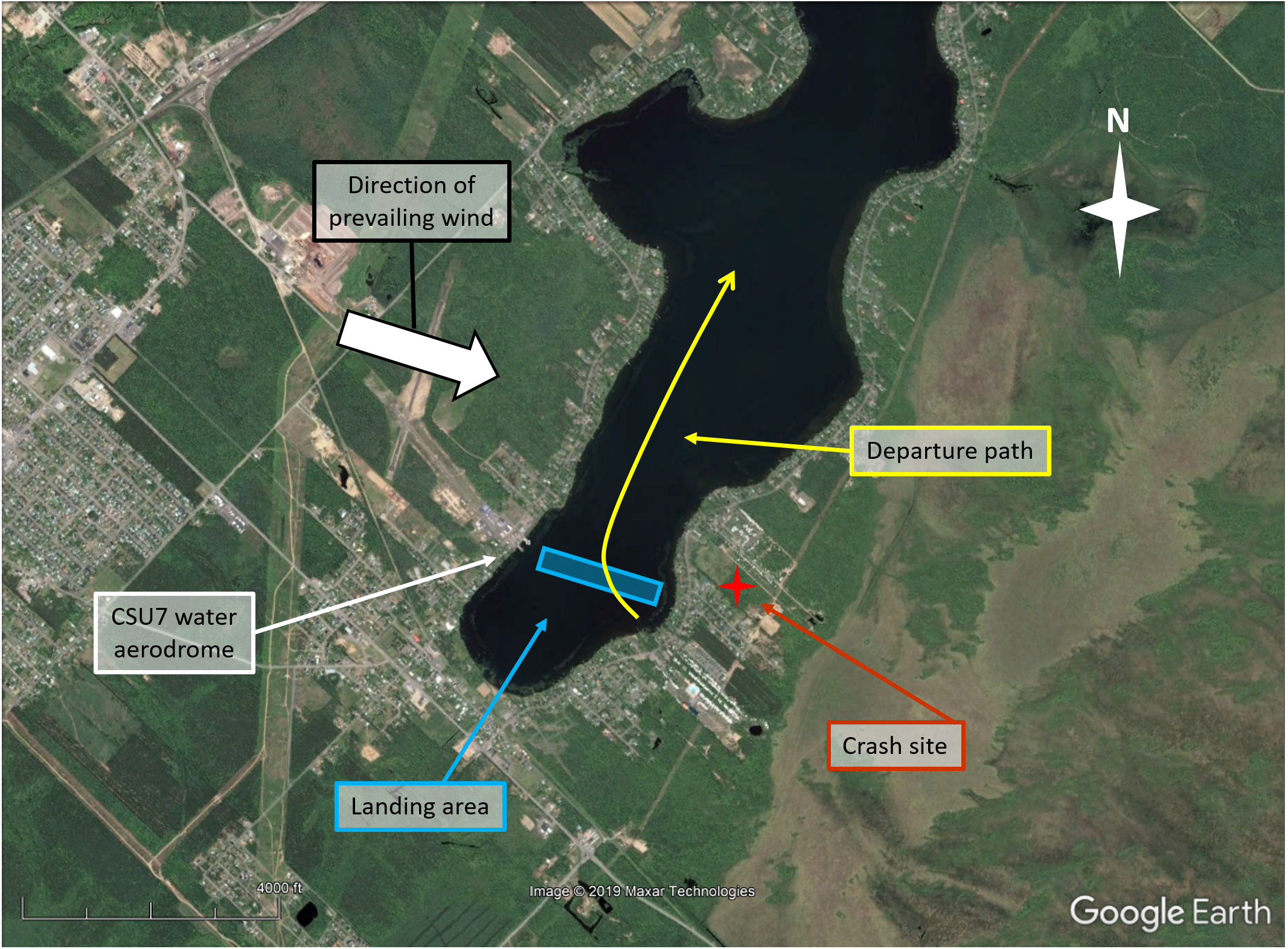The area surrounding the wreckage, approximately 1000 feet southeast of the lake, was a woodland with large, deciduous trees. The first signs of an impact with trees could be found approximately 250 feet southeast of the wreckage (Figure 2).