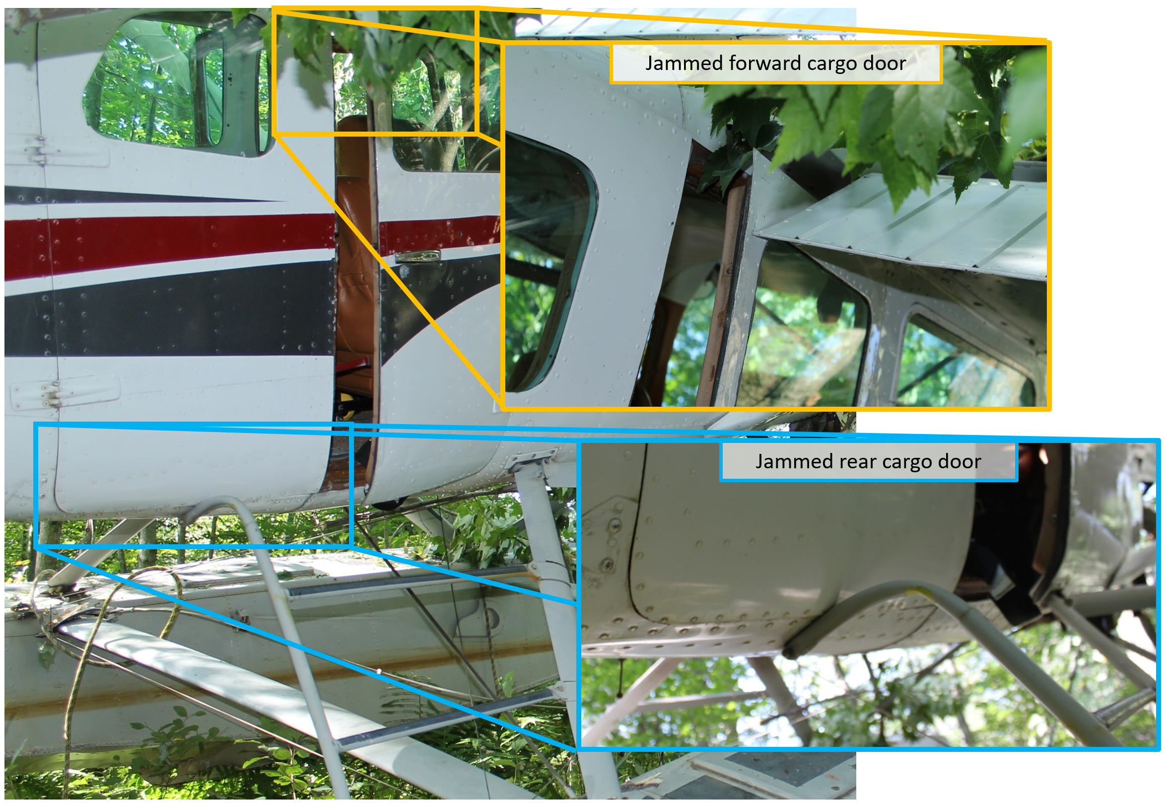 The forward cargo door was partially open and jammed because the flaps were down. This issue, specific to the Cessna 206, was identified and analyzed during TSB investigation A18W0129 and resulted in Aviation Safety Advisory A18W0129‑D1‑A1.Footnote 4 The rear cargo door of the occurrence aircraft was closed and the locking lever was in the stowed position. Investigators attempted to open the rear cargo door, but the top of the ladderFootnote 5 was bent from the impact and was preventing the rear cargo door from being opened (Figure 3).