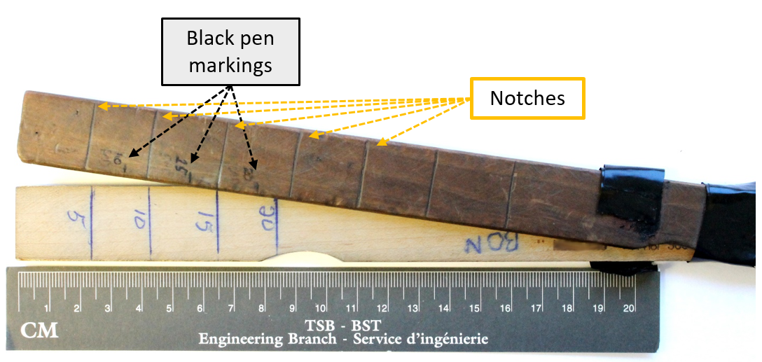 The dipstick used by the pilot was doubled, consisting of 2 sticks glued together at one end (Figure 4). The 1st stick, which was dark brown, had several notches at regular intervals, and 3 black pen markings indicating 10, 15, and 20 gallons. These markings were offset from the notches. The 2nd stick, which was a lighter colour, had blue pen lines indicating 5, 10, 15, and 20 gallons and was labelled ”BON” [good] at the unmarked end (Figure 4). These markings were only visible by spreading the 2 sticks apart. The blue pen marks on the 2nd stick closely matched the notches on the 1st stick. A comparison of the various markings revealed that the black pen marks appeared to indicate quantities approximately 2.5 gallons greater than the quantities indicated by the other markings.