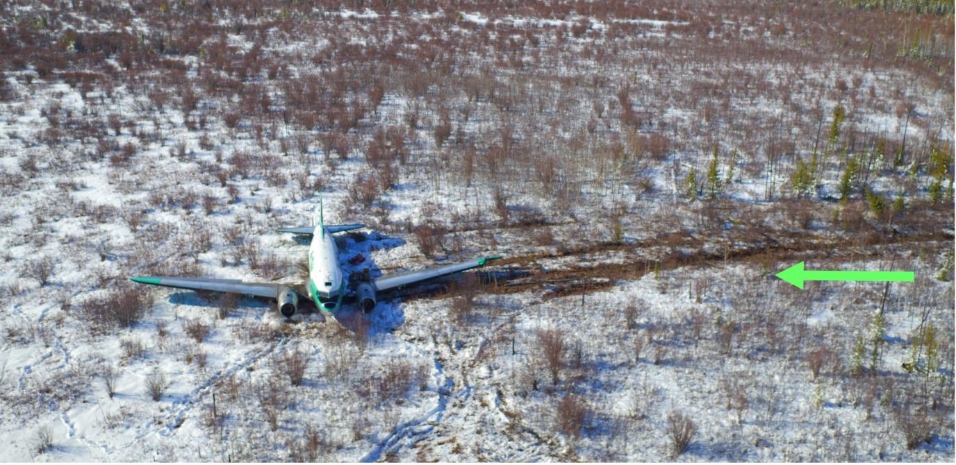 At 0801, the aircraft landed in muskeg on K’atl’Odeeche First Nation land, approximately 3.5 nautical miles southeast of CYHY. After the aircraft came to a stop, the FO exited the aircraft through the right-hand crew window, while the captain remained in the cockpit to secure the right engine and aircraft systems before evacuating via the forward door. The FO contacted the flight information centre to notify them of the crew’s status and aircraft location. The emergency locator transmitter had not activated during the forced landing, so the FO activated it manually to assist search and rescue in locating the aircraft. The flight crew was uninjured. The aircraft received substantial damage (Figure 2). There was no post-impact fire. First responders arrived at the accident site at 1114.
