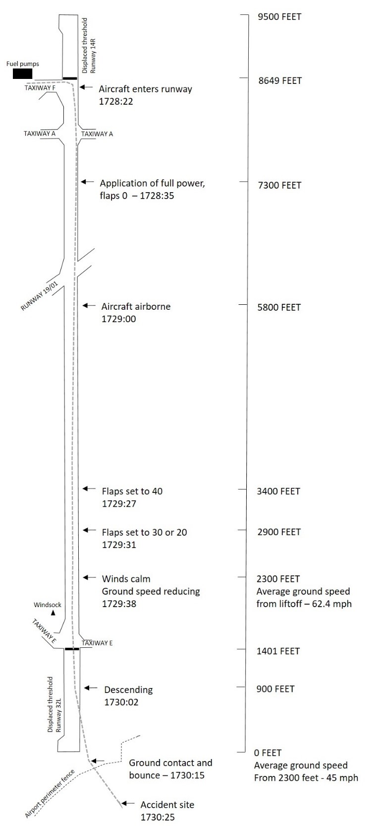 The aircraft became airborne with 5800 feet of runway remaining. The pilot flying put the aircraft into a right-wing-low attitude, which was maintained in varying degrees throughout the takeoff, and the aircraft climbed slowly.