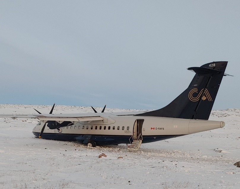 On 26 November 2020, the Calm Air International LP Avions de Transport Régional ATR 42-300 aircraft (registration C-FAFS, serial number 298) was conducting flight CAV464 under instrument flight rules from Rankin Inlet, Nunavut, to Naujaat, Nunavut, with 3 crew members on board. While on descent, the crew observed abnormally low propeller rpm indications on the left engine. At 1326 Central Standard Time, shortly after touchdown on Runway 34 at Naujaat Airport, directional control was lost and the aircraft experienced a runway side excursion on the east side of the runway. The aircraft came to rest approximately 108 feet from the runway edge. The captain received serious injuries. The aircraft sustained substantial damage.