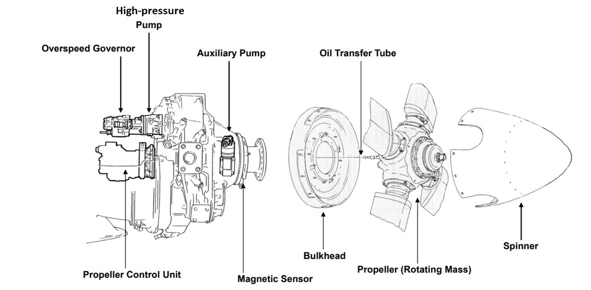 The propeller is controlled by the PCU, which uses high-pressure engine oil to control the blade angle. Engine oil pressure is increased by a high-pressure pump mounted on the propeller reduction gearbox.