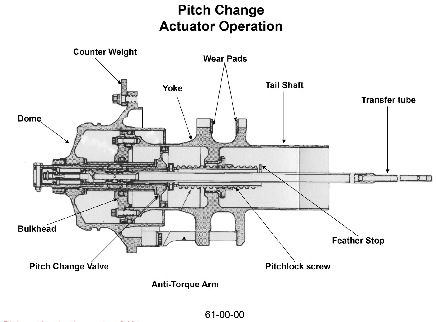 The propeller incorporates several safety devices, one of which is a pitch-lock mechanism. The pitch-lock mechanism is located inside the pitch change actuator. The mechanism locks the blade pitch and prevents propeller overspeed in the event that oil pressure to the PCU is lost. If oil pressure is lost while the propeller is in a positive blade angle, centrifugal and aerodynamic forces will attempt to drive the propeller blades to a flat pitch (approximately 0°). If this were to happen, the propeller would overspeed and produce high drag.