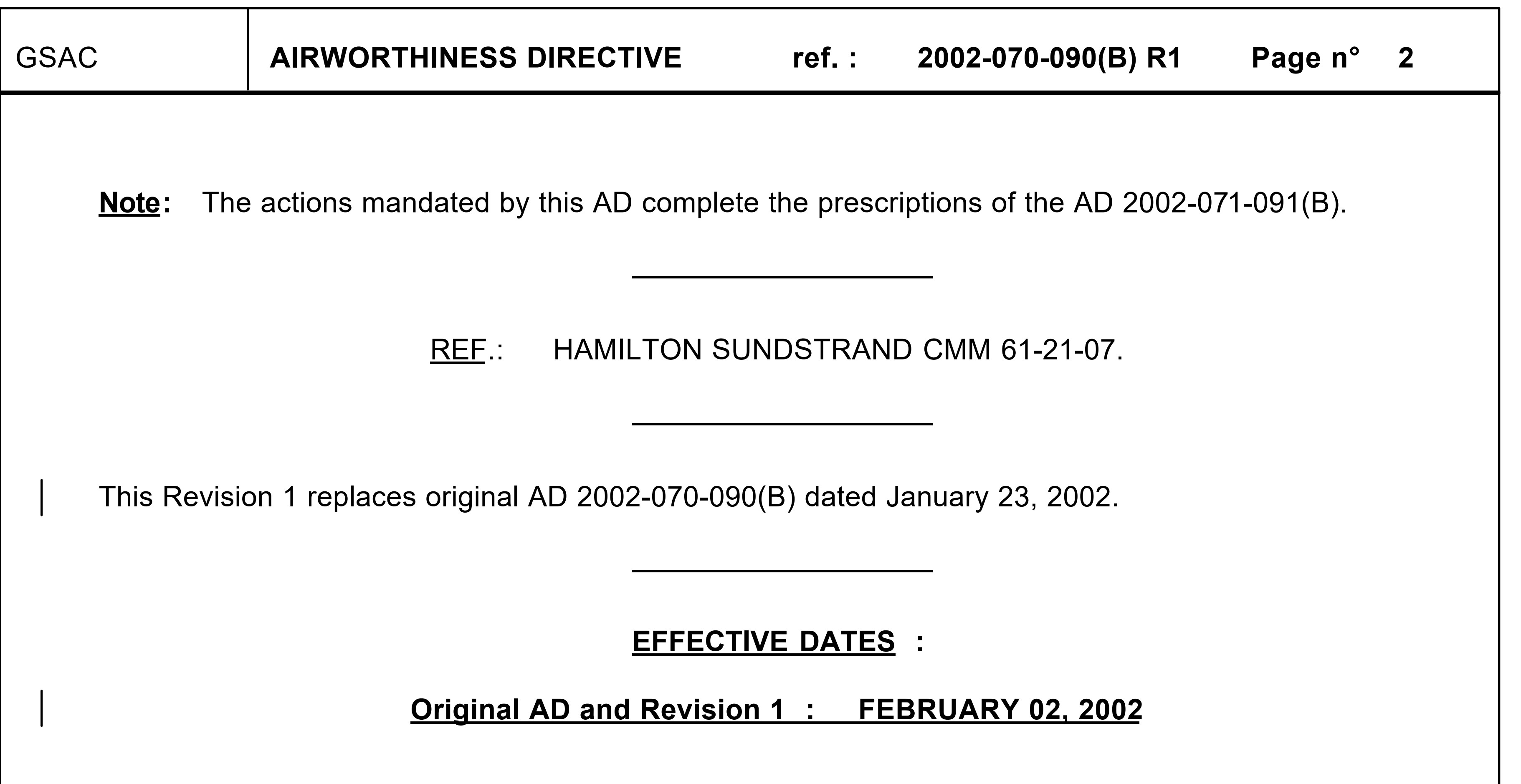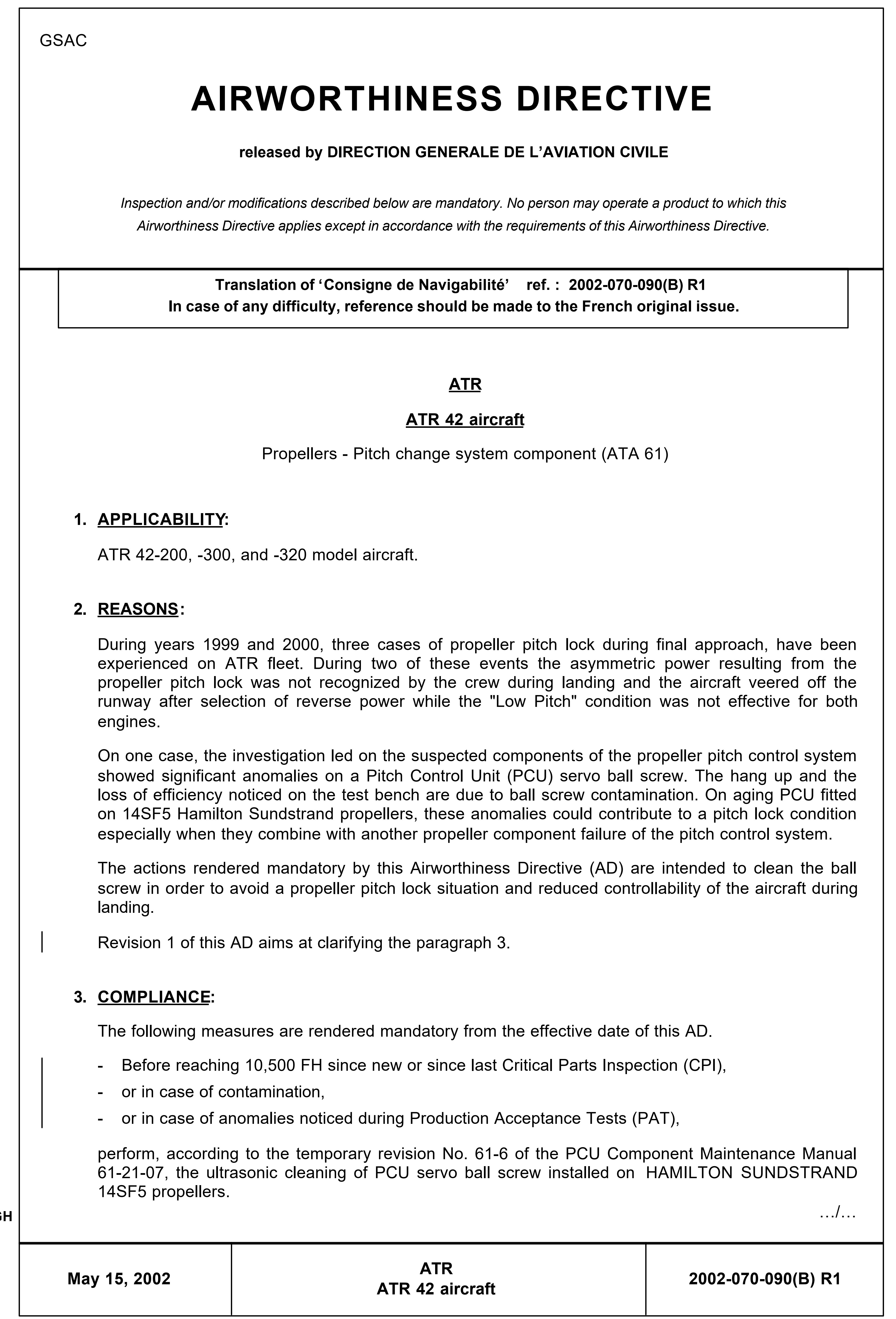 Source: Direction générale de l’aviation civile, Airworthiness Directive AD 2002-070-090(B) R1: ATR 42 aircraft – Propellers – Pitch change system component (ATA 61) (issued 15 May 2002).