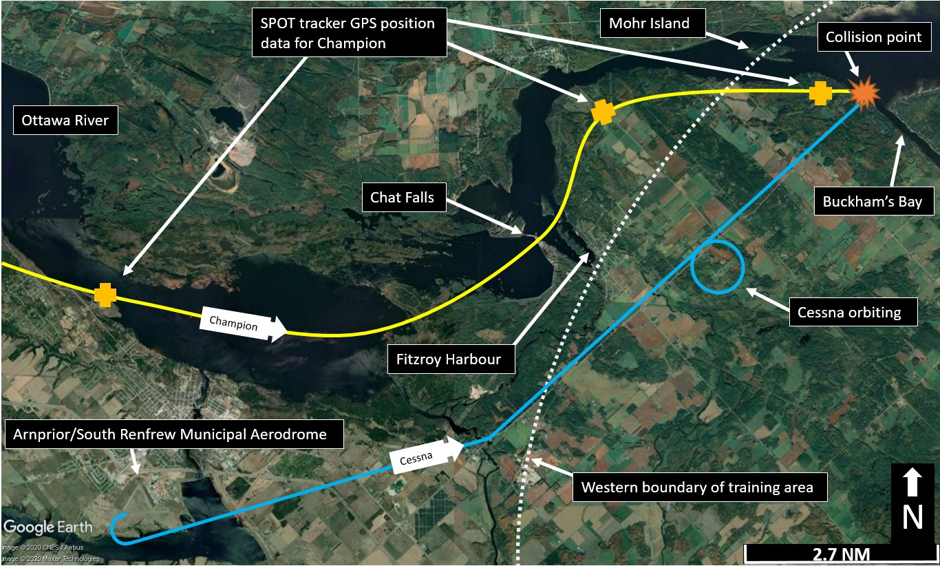 At approximately 1446, the 2 aircraft collided while flying over the Ottawa River near Buckham’s Bay, approximately 12 NM east-northeast of CNP3 (Figure 1).