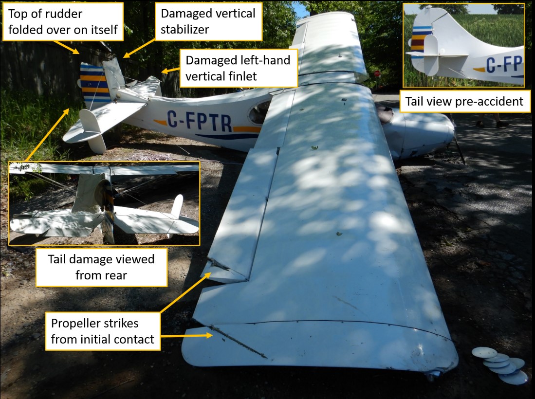 During the collision sequence, the Champion sustained 2 propeller strikes on the top of the right wing: one close to the wing tip, along the trailing edge of the wing, and the other on the right aileron. The tail was extensively damaged in the collision (Figure 2). The damage caused the pilot to lose the ability to control the aircraft using the ailerons, horizontal stabilizer or the rudder. He was, however, able to control the pitch of the aircraft using engine power. Increasing the engine power would pitch the nose of the aircraft up, while decreasing it would pitch the nose down.