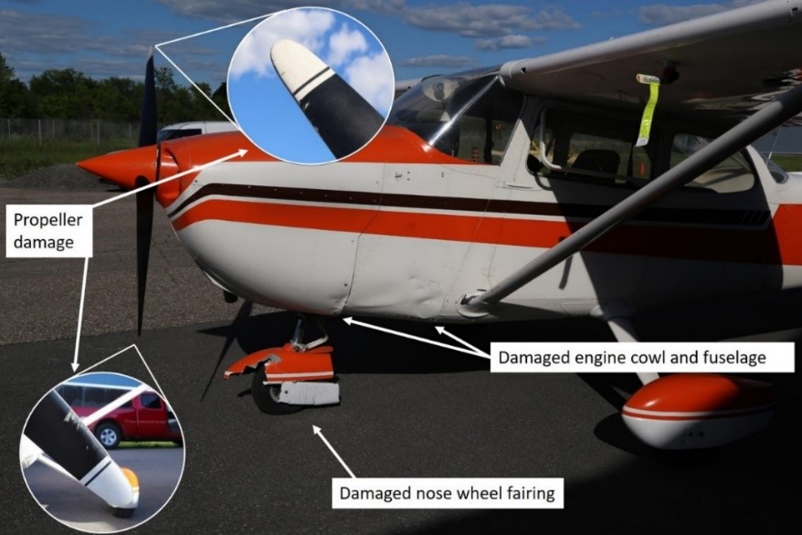 The damage to the Cessna consisted of some scraping and paint marks on both propeller blades, a damaged front wheel fairing, and some damage to the left-hand engine cowl and lower left-hand portion of the fuselage immediately aft of the firewall (Figure 3). The damage did not lead to any control issues for the pilot.