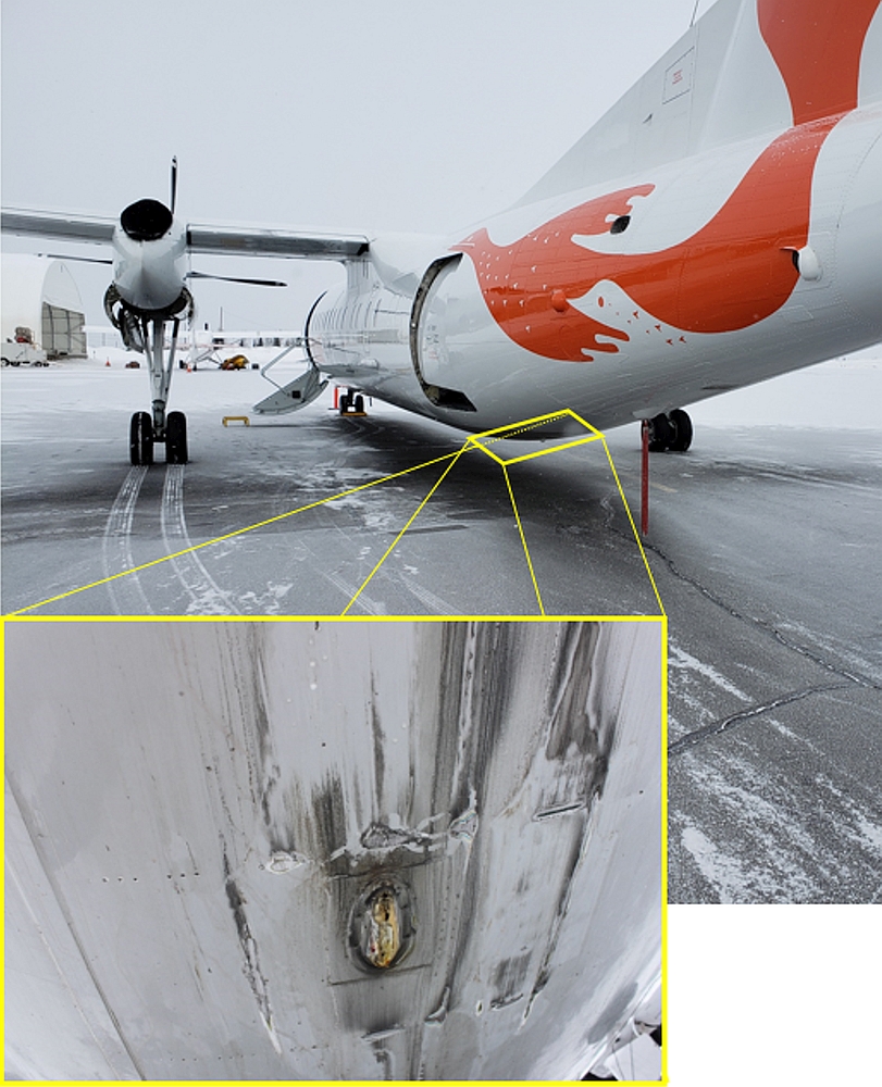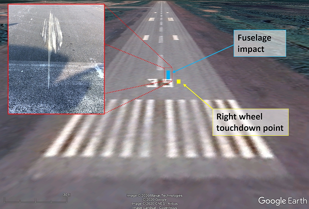 The aft fuselage had friction damage, and the structure was dented. The skin, frame, structural stiffeners, and longerons in the lower part of the fuselage were damaged. The fuselage runway contact sensor was torn from its mount (Figure 2).