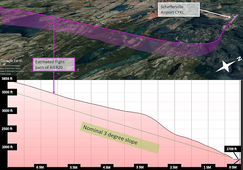 At 1050, the PM contacted air traffic control (ATC) to request clearance for descent. Because radar coverage is not provided below FL 180 in this area, ATC first asked another aircraft departing from CYKL to provide its crossing altitude. Once the aircraft departing from CYKL was radar-identified, ATC cleared AIE820 for descent. At 1051, the PF began the descent from FL 230.