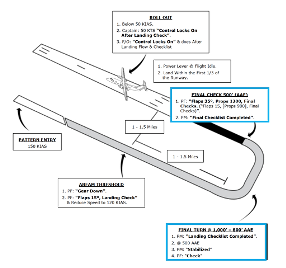 According to the SOPs, the aircraft must be stabilized in the landing configuration at 120 KIAS (deviation tolerance of −5 KIAS and +10 KIAS) by 500 feet AAE. The SOPs also indicate that, during an instrument approach, flaps are lowered to 35° and the final checklist is performed when landing is assured. This means that, when weather conditions are near the approach minima, flap selection and the final checklist are often done below 500 feet AAE, in some cases at 250 feet AAE. Therefore, an IFR approach may be continued below 500 feet AAE although the flaps have not been set to the landing position and the final checklist has not been completed. Consequently, it is not possible to comply with the operations manual policy while following the procedures in the SOPs.